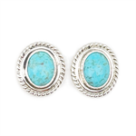 Sterling silver post earring with an oval stabilized Kingman turquoise stone has a plain and twist wire border. Top measures just over 1/2" long by 1/2" wide. Post is at the top. It is Navajo hand made by Peggy Skeets. Shade of turquoise are all blue but amount of matrix will vary.