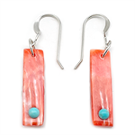 These dangle rectangle shape earrings are hand cut out of spiny oyster shell and it has a turquoise dot set at the bottom. It measure approximately 1 3/8" - 1 7/8" long with sterling silver french wire by just over 1/4" wide. It is Zuni hand carved and crafted by Jesus Espino. Color shades available in orange and red's with some white in them. Shapes and sizes will vary but mostly in rectangles or tapered rectangle.  Choose color when ordering.