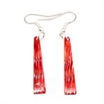 These slab earrings are hand carved out of spiny oyster.  They measure approximately 2" - 2 1/2" long with sterling silver french wires by 1/4" - 3/8" wide at widest.  They are Zuni hand made and crafted by Jesus Espino.  Color shades available are red (some with white areas) or orange some with white  Shapes currently available in tapered rectangles or long rectangles. Choose color preference and shape when ordering.